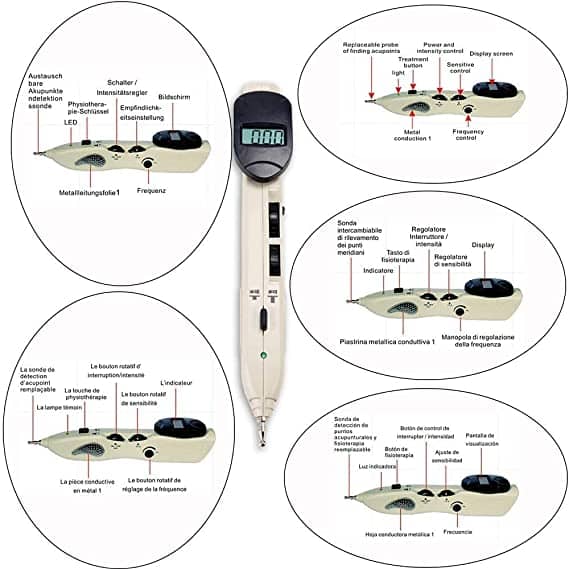The point detection sensitivity is adjustable. The “SEN” knob is used to either increase (clockwise adjustment) or decrease (counter clockwise) sensitivity when used on different skin conditions (i.e. dry or moist skin). The level of sensitivity can be read from the Digital Display Chamber.