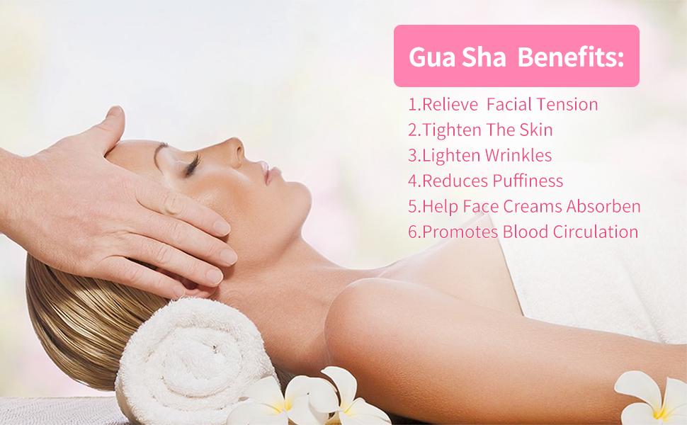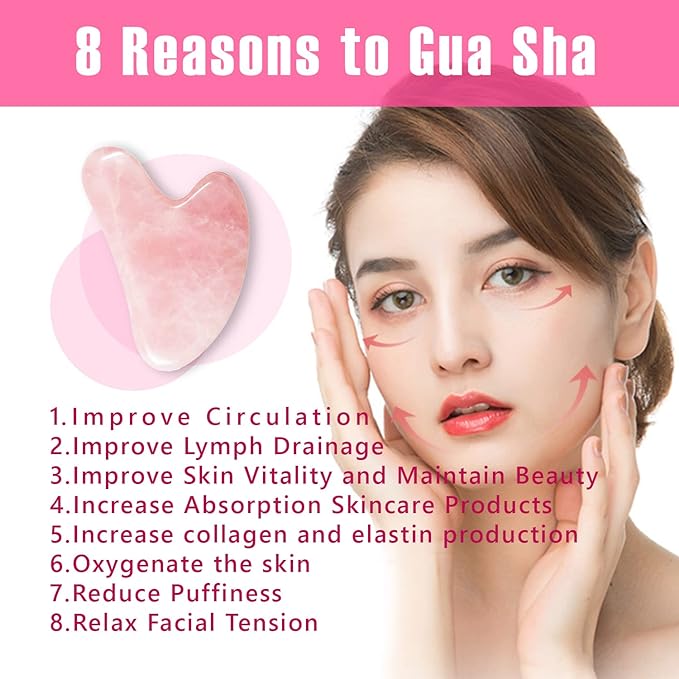 The Secret of Beautiful Skin Rose Quartz Gua sha rose quartz gua sha Gua sha, or 刮痧, directly translates to “scratch” and “sand” (here, the sand refers to the raised redness on the skin instead of actual sand). “‘Sha’ is caused by the bacteria or virus toxins, which break the capillaries and form hyperemia areas, or spots in the skin or mucus, and form sand-like scattered or condensed areas,” said Wang. The sand analogy stemmed from the act of performing gua sha, where technicians gently scrape the skin and see tiny dots under the skin emerge; these little granules resemble pieces of sand, which led to their name, Wang elaborated. After applying gua sha, it is common for users to experience redness or tenderness (a sign of blood renewal), but those effects will subside within a few days. rose quartz gua shaPromotes lymphatic drainage Promotes lymphatic drainage. Gua sha can eliminate fluid build-up, which can in turn reduce puffiness, experts said. gua sha face massage toolsImprove fine lines and wrinkles Improve fine lines and wrinkles. Gua sha “can temporarily improve the appearance for the newly and very gentle ones,” Wang said. However, she noted that “for long-standing wrinkles, gua sha should not be the first choice.” gua shaRelieves tension from muscles. Relieves tension from muscles. Experts noted that by applying pressure with a gua sha tool regularly, users can untangle knotted areas and release built-up muscular tension rose 1Promote blood circulation. Promote blood circulation. “From a Chinese medicine perspective, the Tai Yin meridians (composed of the lung and spleen) and Yang Ming meridians (composed of the large intestines and the stomach) are responsible for your skin’s overall health,” said Lee. “When you gently scrape the skin on your face with your gua sha tool, what you are doing is stimulating your Yang Ming meridians. You are also sending your body a signal that this area needs more blood circulation.”