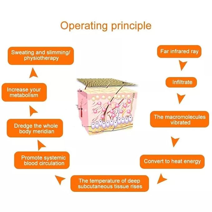 Working principle:Far infrared rays penetrate into the body, the large molecular group vibrates and converts into heat energy, which increases the temperature of deep tissues of the skin, promotes blood circulation throughout the body, clears the meridians in the body, accelerates metabolism in the body, perspiration and slimming/slimming physiotherapy