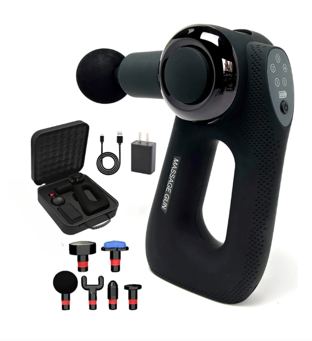 This massage gun comes with six interchangeable head attachments, each designed to target specific muscle groups and deliver different types of massage: