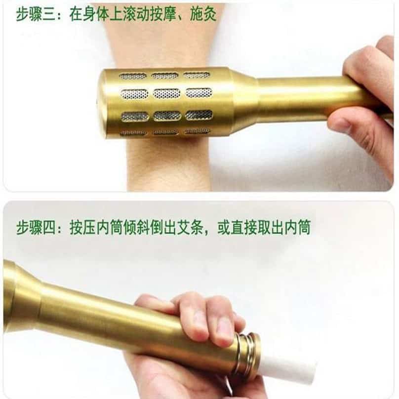 Insert moxa stick into the inner sleeve with holding clamps, ignite, and place sleeve into the outer protective cover. Adjust the burning moxa stick in the holding clamps as necessary during treatment. Facial: Speed up blood circulation, strengthen regeneration of new cells, pigmentation, reduce wrinkles, ruddy complexion, anti-aging. Moxa: Circular motion from the bottom up ( face:10 minutes, eye: 3 minutes) Body: Clear the meridians, the balance of yin and yang, adjustment of physiological functions, enhance the body’s immune system and physical health. Abdomen: Oil massage and then moxa 15 minutes